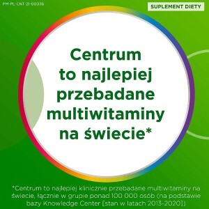W 1 tabletce: witamina A (mcg ekwiwalentu retinolu) (25% jako beta-karoten) 800 mcg (100% RWS – referencyjnych wartości spożycia), witamina E (mg ekwiwalentu alfa-tokoferolu) 15mg (125% RWS), witamina C 100 mg (125% RWS), witamina K 30 mcg (40% RWS), witamina B1 (tiamina) 1,4 mg (127% RWS), witamina B2 (ryboflawina) 1,75 mg (125% RWS), witamina B6 2 mg (143% RWS), witamina B12 2,5 mcg (100% RWS), witamina D 5 mcg (100% RWS), biotyna 62,5 mcg (125% RWS), kwas foliowy 200 mcg (100% RWS), niacyna (mg ekwiwalentu niacyny) 20 mg (125% RWS), kwas pantotenowy 7,5 mg (125% RWS), wapń 162 mg (20% RWS), fosfor 125 mg (18% RWS), magnez 100 mg (27% RWS), cynk 5 mg (50%) RWS, jod 100 mcg (67% RWS), miedź 500 mcg (50% RWS), mangan 2 mg (100% RWS), chrom 40 mcg (100% RWS), molibden 50 mcg (100% RWS), selen 30 mcg (55% RWS), żelazo 5 mg (36% RWS)CENTRUM Kompletne od A do Z - dawkowanie: