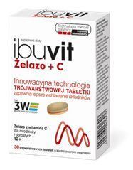 substancja wypełniająca: celuloza mikrokrystaliczna, fosforan wapnia; witamina C (kwas l-askorbinowy); żelazo (pirofosforan żelaza (III)); stabilizator: hydroksypropylometyloceluloza; żelazo (diglicynian żelaza (II), siarczan żelaza (II)); substancje przeciwzbrylające: mono- i diglicerydy kwasów tłuszczowych, sole magnezowe kwasów tłuszczowych, dwutlenek krzemu; stabilizator: hydroksypropyloceluloza; substancja przeciwzbrylająca: guma celulozowa usieciowana, poliwinylopolipirolidon; barwniki: tlenki i wodorotlenki żelaza<br />W 1 tabletce: warstwa FAST - żelazo 6,66 mg, warstwa NORMAL - żelazo 6,67 mg, witamina C 70 mg (87,5% RWS - referencyjnych wartości spożycia), warstwa RETARD - żelazo 6,67 mg. Żelazo ogółem - 20 mg (142,9% RWS)IBUVIT ŻELAZO+C - dawkowanie: