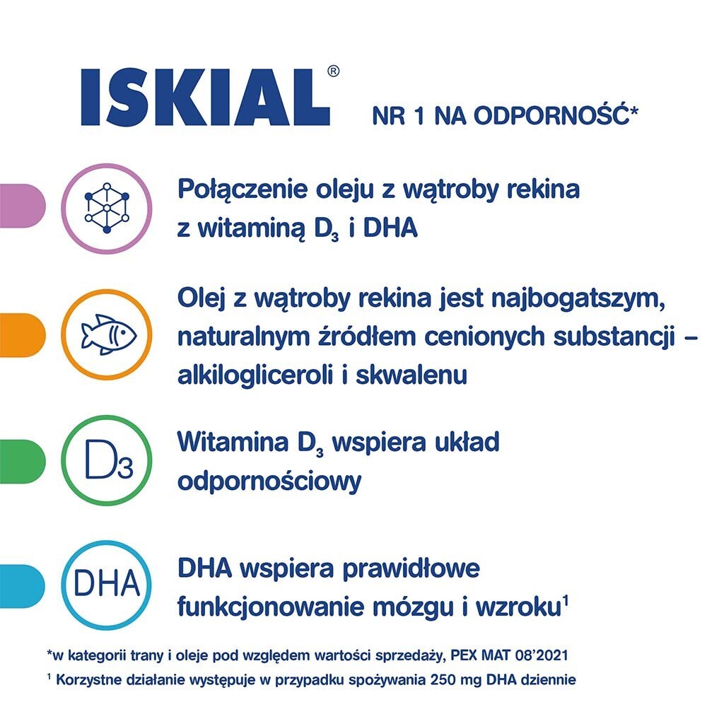 ISKIAL JUNIOR w kapsułkach do żucia to kompleksowa formuła, która łączy w sobie olej z wątroby rekina z wysoką zawartością witaminy D3 wspomagającej prawidłowe funkcjonowanie układu odpornościowego oraz DHA (kwas omega-3) wspierający prawidłowe funkcjonowanie mózgu i wzroku.