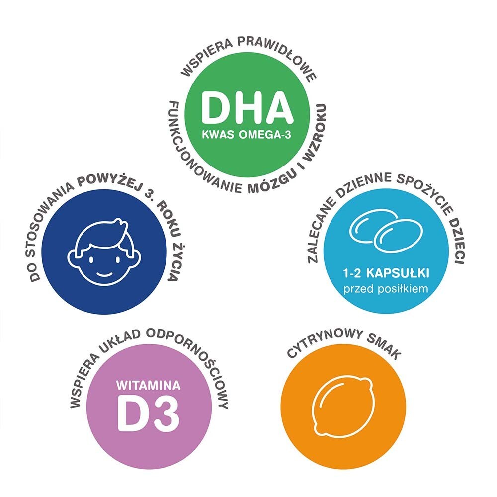 W 1 kapsułce: olej z wątroby rekina 250 mg, olej rybi 275 mg, w tym DHA 129 mg DHA, witamina D 12,5 µg (250% RWS - referencyjnych wartości spożycia)