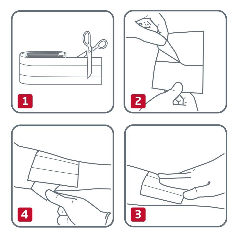 oczyścić ranę i upewnić się, że nie jest zainfekowana. Przy pomocy nożyczek uciąć wymaganą ilość plastra, usunąć zabezpieczenie kleju i zamocować. Plaster zmieniać wedle potrzeby.
