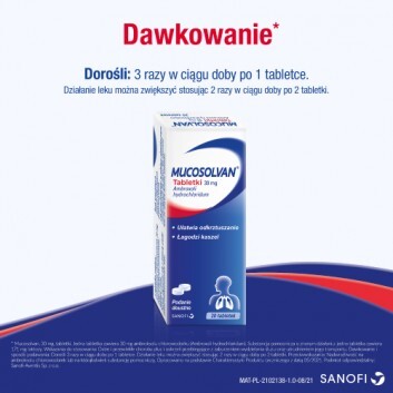 dorośli - 3 razy w ciągu doby po 1 tabletce; działanie leku można zwiększyć stosując 2 razy w ciągu doby 2 tabletki. Nie należy stosować przed snem.MUCOSOLVAN tabletki - przeciwwskazania: