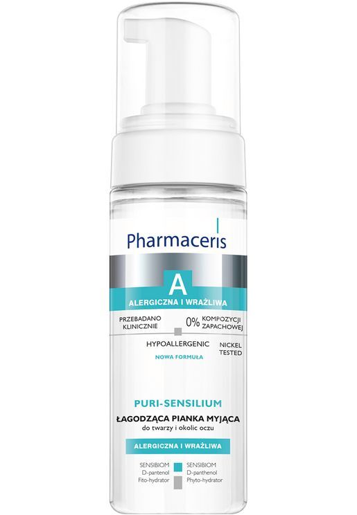pianka do codziennego mycia i demakijażu twarzy i okolic oczu dla skóry szczególnie wrażliwej i podatnej na alergię. Bezpieczna dla osób stosujących soczewki kontaktowe. Odpowiednia dla diabetyków. Niekomedogenna.PHARMACERIS A PURI-SENSILIUM łagodząca pianka myjąca do twarzy i okolic oczu - sposób użycia:
