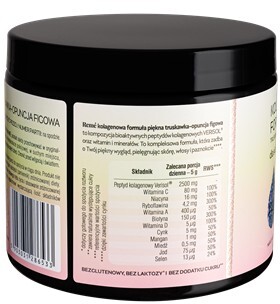 peptyd kolagenowy Verisol; maltodekstryna; kwas: kwas jabłkowy; substancja zagęszczająca: guma guar; aromaty; sproszkowany sok z czerwonego buraka; kwas L-askorbinowy; substancja słodząca: glikozydy stewiolowe ze stewii; glukonian cynku; amid kwasu nikotynowego; D-biotyna; jodek potasu; glukonian manganu; ryboflawina; octan retinylu; glukonian miedzi (II); sproszkowana opuncja figowa; sproszkowane owoce truskawki; selenian (IV) sodu; cholekalcyferol. Może zawierać jajka, soję, mleko, łubin i ich produkty pochodne.
