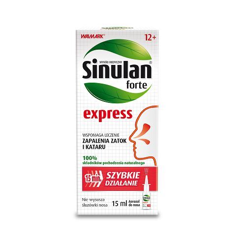 SINULAN FORTE EXPRESS wykazuje szybkie działanie - już po 15 minutach od aplikacji - a dzięki właściwościom Filmogenu (hipertoniczny i nawilżający roztwór) - również długotrwałe. Jest bezpieczny: działa miejscowo i chroni powierzchnię błony śluzowej nosa przed wysuszeniem, podrażnieniami oraz czynnikami zewnętrznymi. Preparat może być stosowany przez kobiety w ciąży oraz kobiety karmiące piersią po konsultacji z lekarzem. Brak przeciwwskazań dla pacjentów z nadciśnieniem i jaskrą. Nie powoduje gorzkiego posmaku po aplikacji.