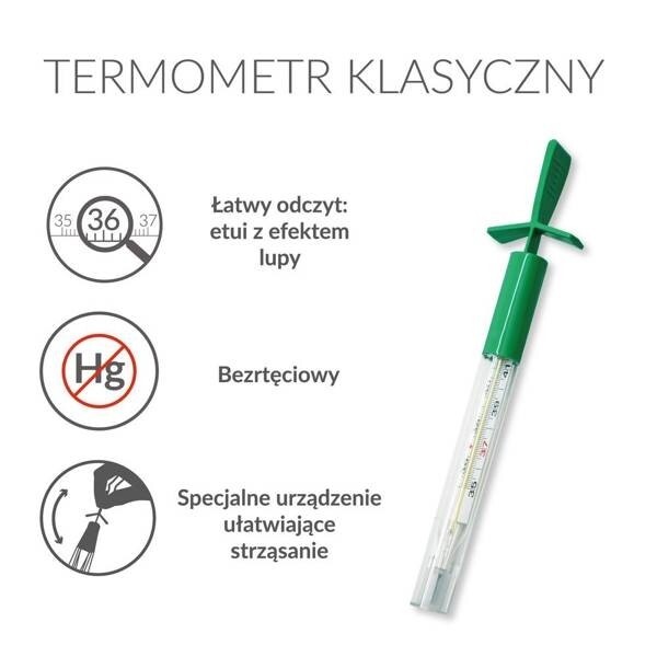 Szklany termometr klasyczny to najbardziej podstawowe narzędzie diagnostyczne umożliwiające dokonanie dokładnego pomiaru temperatury ciała w domowych warunkach.
